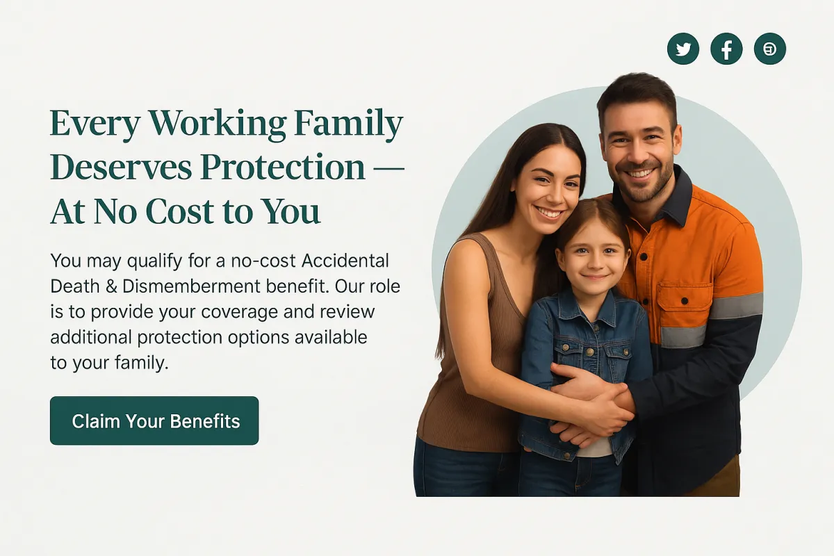 You may qualify for a no-cost Accidental Death & Dismemberment benefit. Our job is to deliver your coverage and explain additional protection options available to your family.